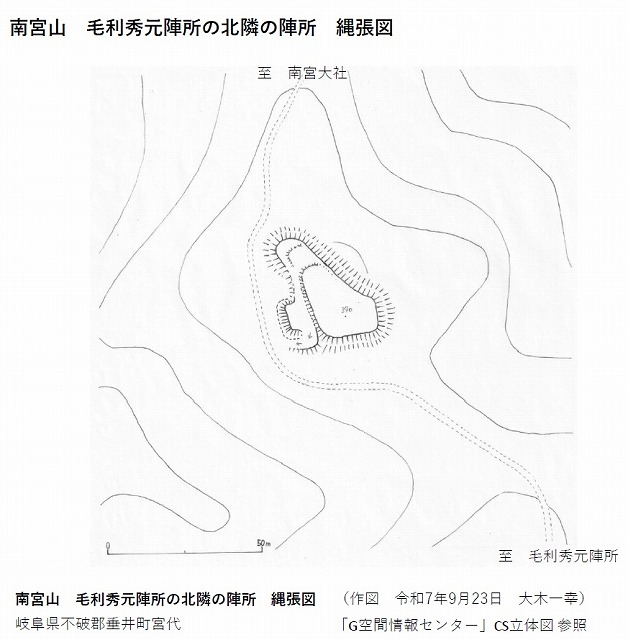 南宮山の見所のひとつは、9月に下見した担当者(繁田、大木)が、CS立体図で陣所跡がありそうだと狙いをつけていた、毛利秀元陣跡から200m北にある小ピークでした。確認した結果、知られていない遺構跡であると判断し、見学会資料にも縄張図も添付しておりましたので、参加者全員でじっくりと確認しました。これが遺構だということは、南宮山の山稜に点在する南宮十坊の跡地等はいずれも毛利軍が駐屯したと言えるだろうということが想像できました。